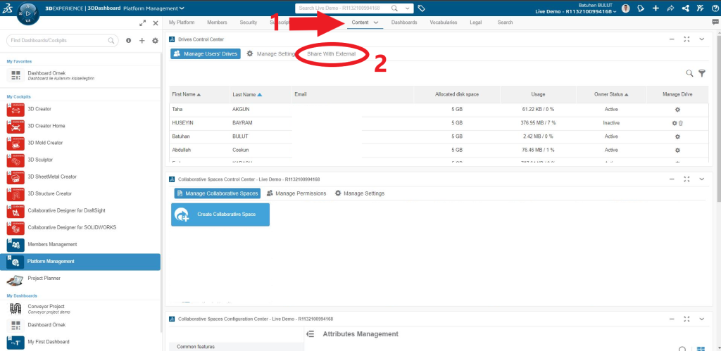 Platform Management adlı Dashboard’a giriş yaptıktan sonra bir numaralı ok ile işaretlenen Content sekmesine girelim ve ardında iki numarada daire ile işaretlediğim “Share with External” seçeneğine girelim.