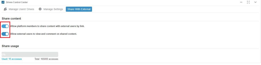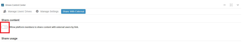 “Share with External” seçeneğine giriş yaptığınızda aşağıdaki görselde olduğu gibi bir görüntü ile karşılaşırsınız. Kırmızı ile belirtilen seçeneği aktif hale getirdiğinizde dosyalarınızı artık dış kaynaklar ile paylaşabilirsiniz.
