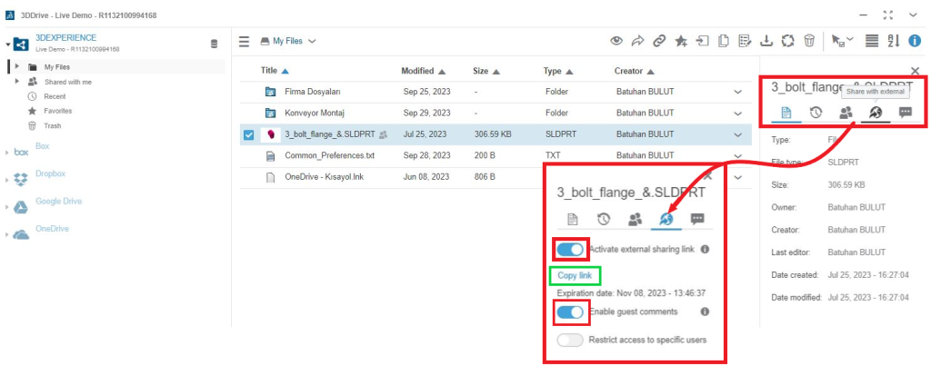 Artık dosyamızı dış kaynaklara paylaşabilir duruma geldik. Şimdi 3DDrive uygulaması üzerinden bir dosyamın seçeneklerini görüntülediğimde “Share with External” sekmesinin geldiğini görebiliriz. Bu sekme altında “Activate external sharing link” butonunu aktif ettiğimizde dosyamıza bağlantıyı paylaştığımız kişiler erişebilir, indirebilir ve görüntüleyebilir. Diğer bir seçenek olan “Enable guest comments” seçeneğini aktifleştirdiğimizde ise paylaşım bağlantısına ulaşabilen kişiler yorum yapabilir ve iş birliği yapabilirsiniz.