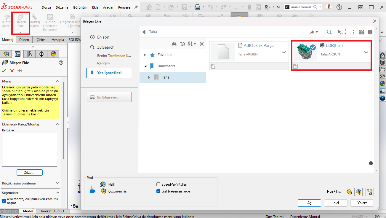Montaj dosyasındaki Bileşen Ekle aracını, Aç menüsündeki gibi, 3DEXPERIENCE’tan Aç’ı seçerek kullanılabilirsiniz.