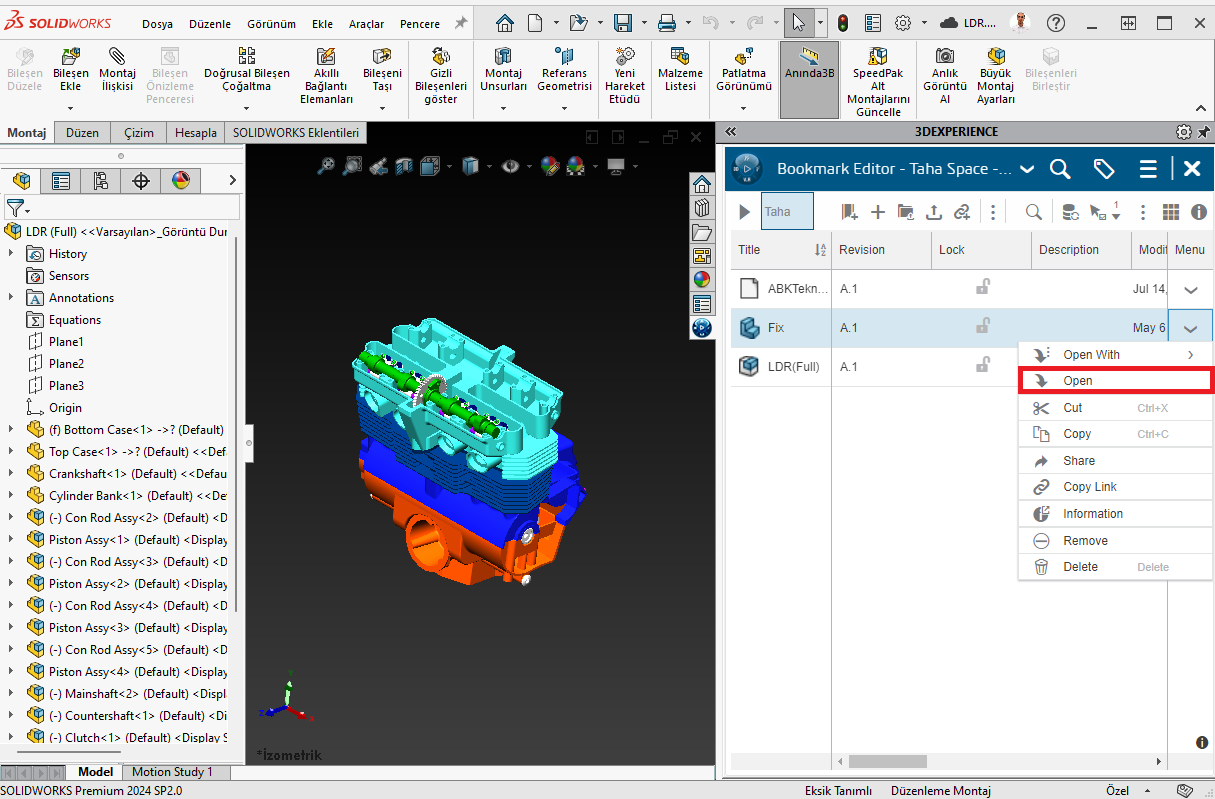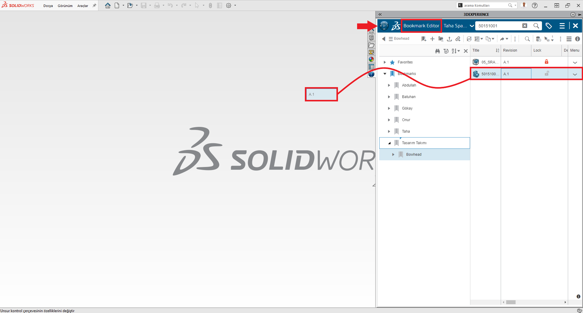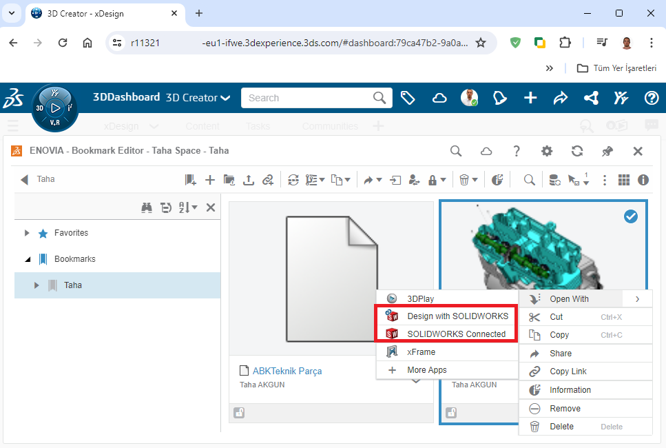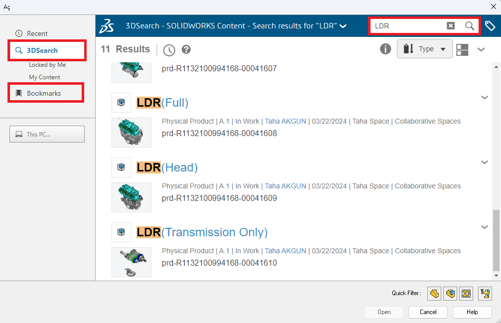SOLIDWORKS arayüzündeki standart Aç komutunu çalıştırıp 3DEXPERIENCE’te Aç seçeneğine tıklandıktan sonra açılan pencerede 3DSearch ya da Bookmarks kullanarak platformda kayıtlı olan modeli açabilirsiniz.