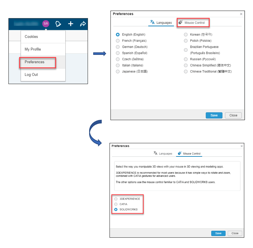 - SOLIDWORKS, CATIA veya varsayılan 3DEXPERIENCE fare profili gibi ihtiyaçlarınıza en uygun fare profili seçeneğini belirterek pano uygulamanızdaki bakış açılarına daha kolay erişim