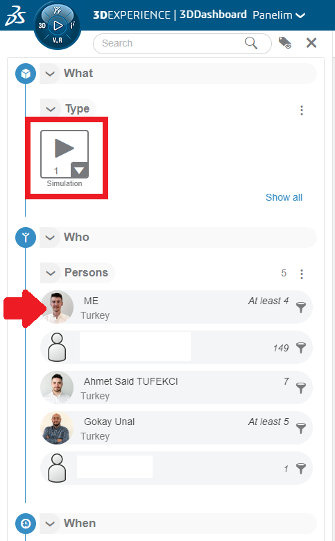 Bir alt “Who” bölümünde ise kişi filtrelemesini gerçekleştirebilirsiniz. İsterseniz tüm simülasyon öğelerini, isterseniz kişi bazlı filtrelemesi yapabilirsiniz. Ayrıca bu bölüm içerisinde çok farklı filtrelemeler yapmak da mümkün.