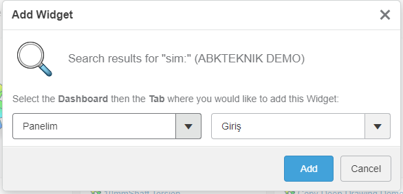 Karşımıza yeni bir ekran açılacaktır. Bu bölümde oluşturmak istediğiniz Widget’ın hangi Dashboard ve hangi sekmede olmasını seçebilirsiniz. Ardında “Add” butonuna tıkladığınızda işlem tamamlanmış olacaktır.