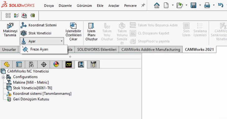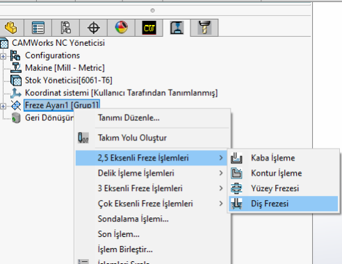 Unsur ağacında oluşan “Freze Ayarı1” tanımına sağ tıklayarak “2.5 Eksenli Unsur” satırı tıklanır.