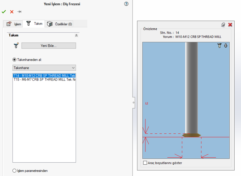 Bu pencere takım bölümü açık şekilde bizi karşılamaktadır. Burada istediğimiz dişe uygun takımı seçebiliriz. Ayrıca İşlem Parametresinden satırını onaylarsak açılan işlem üzerinden takım seçebiliriz.