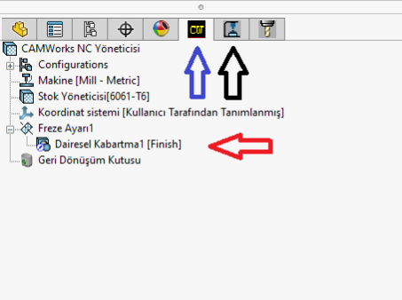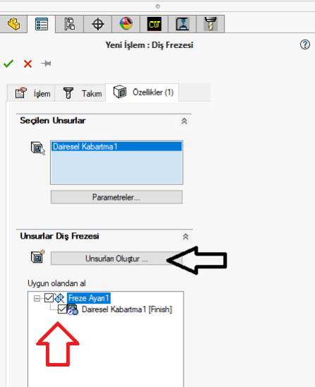 Seçilen diş boyunun onaylanmasının ardından unsur ağacında kırmızı okla gösterildiği gibi bir unsur oluşmaktadır. Mavi okla gösterilen kısımda herhangi bir frezeleme işlemi yapmak mümkün değildir. Bu kısım unsurların oluşturulacağı kısımdır. İş parçamız üzerinde oluşturduğumuz unsura diş açabilmek için siyah okla gösterilen kısmı sol tıklayarak o bölüme giriş yapmamız gerekmektedir.