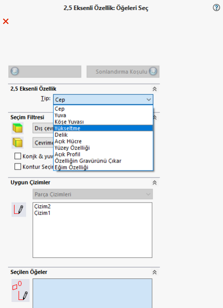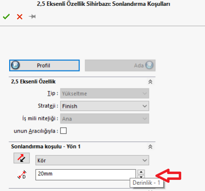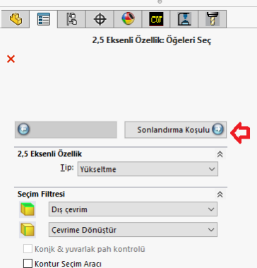 İşlemin ardından sol köşede açılan pencerede “Sonlandırma Koşulu” sekmesi sol tık ile tıklanır. Burada açacağımız dişin boyunu seçebilmekteyiz.