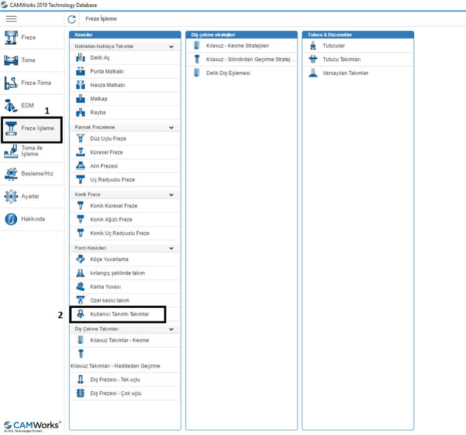 Adım 3 : CAMWorks teknoloji veritabanı içerisinde giriyoruz. Teknoloji veritabı içerisinden ilk olarak "Freze İşleme" seçeneğine tıklıyoruz. Sonrasında "Kullanıcı Tanımlı Takımlar" sekmesine tıklıyoruz.