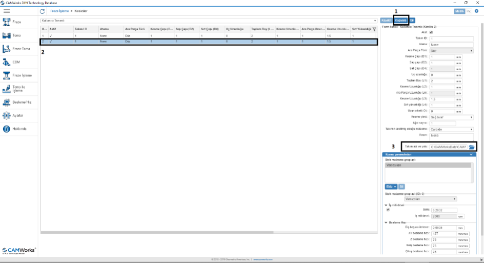 Adım 4 : Kullanıcı Tanımlı Takımlar içerisine girdiğimiz zaman bir adet takım göreceğiz. İlk olarak "Kopyala" diyoruz. Kopyala dedikten sonra farklı bir özel takımın eklendiğini görüyoruz. Kesici takımımızın ölçü ve değerlerini girdikten sonra "Takım adı ve Yolu" sekmesinden kaydettiğimiz takımın konumunu belirtiyoruz. Son olarak kaydet diyerek teknoloji veritabanından çıkıyoruz.
