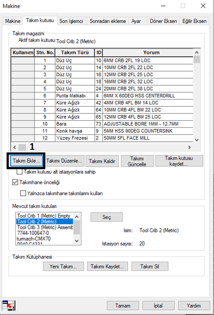 Adım 5 : CAMWorks içerisinden "Makineyi Tanımla" seçeneğine tıklıyoruz. Takım Kutusu sekmesi içerisinden "Takım Ekle" diyoruz.