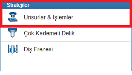 “Stratejiler” başlığı altından Unsurlar & İşlemler sekmesine girilir. Burada CAMWorks’te tanımlı tüm özellikleri ve bu özellikler için oluşturulmuş stratejileri görebilirsiniz. Her stratejinin yanında, kaç koşul içerdiği parantez içinde belirtilmiştir.