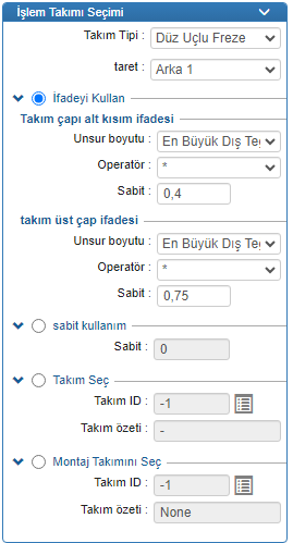 İfadeyi Kullan, Sabit, Takım Seç, Montaj Takımı Seç gibi seçeneklerle takım tanımı yapılabilir.