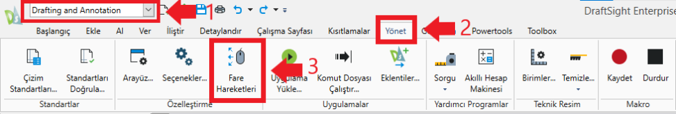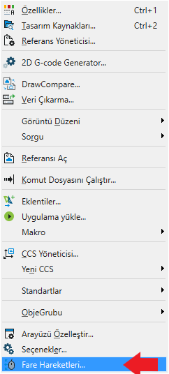 DraftSight’ta iki farklı arayüz seçeneği olduğundan Fare Hareketleri iki yolla düzenlenebilir. Classic arayüzü kullanılıyorsa Araçlar > Fare Hareketleri… seçilir.
