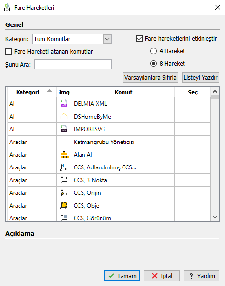 İletişim kutusu listesi, komutları işleve göre gruplandırır. Fare Hareketi atanan komutlar seçeneği, yalnızca düğmelere atanan komutları filtreleyecektir.