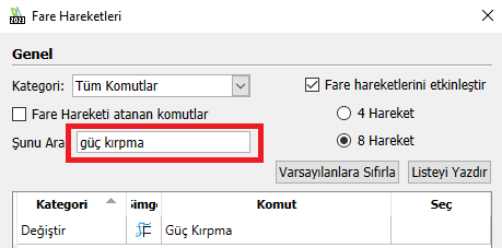 Tamam’a tıklayıp çıkıldığında komut, seçtiğimiz fare yönüne atanmış olur.