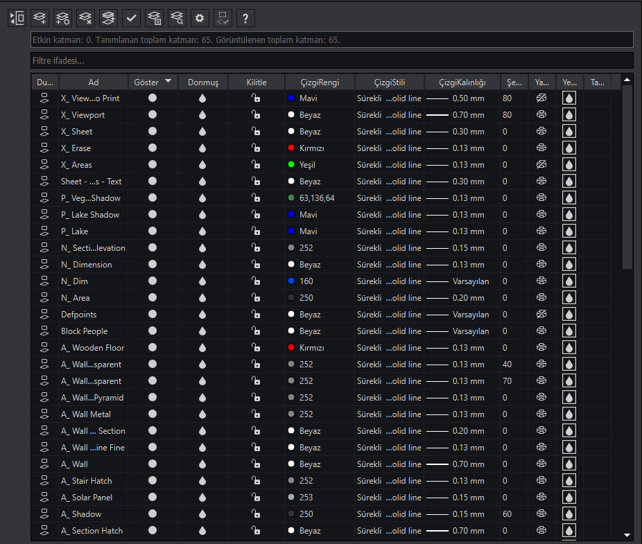 - Yazdırma Durumu (Plot): Katmanın yazdırılıp yazdırılmayacağı kontrol edilir.