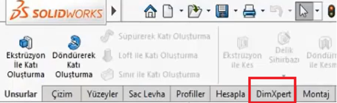 Kafa karışıklığı genellikle burada başlar. Eğer uzun yıllardır SOLIDWORKS kullanıcısıysanız, DimXpert’in kendi CommandManager sekmesi olduğunu hatırlayabilirsiniz.