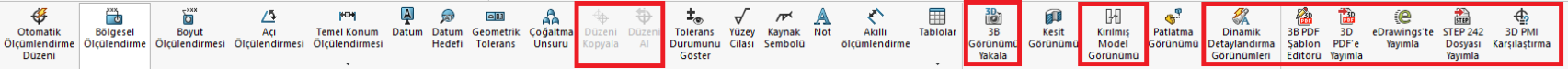 MBD için ayrı CommandManager sekmesi, DimXpert/MBD Dimension sekmesiyle önemli ölçüde örtüşür, ancak aynı zamanda yalnızca MBD eklentisiyle kullanılabilen birkaç araç içerir (kırmızıyla vurgulanmıştır):