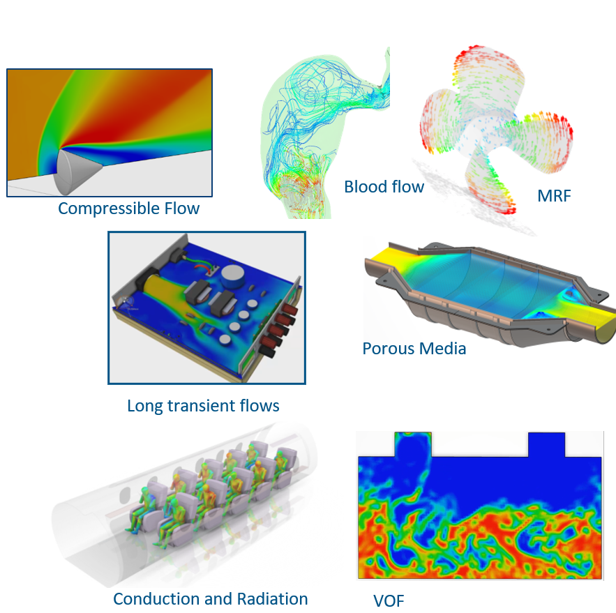 SIMULIA Akışkanlar Dinamiği Mühendisi Rolü, valflerde basınç düşüşü, tıbbi cihazlarda ölü bölge tespiti, tüketici ürün tasarımında türbülansların azaltılması gibi geniş bir uygulama yelpazesi için kapsamlı ve sağlam Akışkan Akışı fiziği yetenekleri sunar. Eşlenik ısı transferinin etkileri dahil olmak üzere hem iç hem de dış akışları çözebilir. CAD özellikli Hesaplamalı Akışkanlar Dinamiği (CFD) yaklaşımıyla Akışkanlar Dinamiği Mühendisi (FMK-OC), kullanıcıların 100’lerce tasarım varyasyonunu hızla keşfetmelerini sağlar, verimli termal yönetim, minimum basınç kayıpları vb. temelinde ürün performansını iyileştirir, endüstri standardı RANS (Reynolds Ortalamalı Navier-Stokes) tabanlı sonlu hacim Hesaplamalı Akışkanlar Dinamiği (CFD) teknolojisini kullanır. Ayrıca, spalarat-Allparas, k-epsilon, sst-omega gibi türbülans modelleri de bulunur.