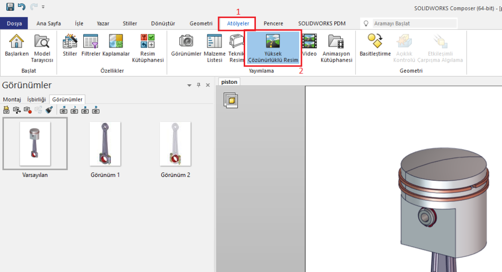 Composer içerisinden resim dosyası formatında çıktı almak için “Yüksek Çözünürlüklü Resim” seçeneği kullanılmaktadır. Üst kısımda bulunan “Atölyeler” sekmesi içerisinden “Yüksek Çözünürlüklü Resim” seçeneğine erişebilirsiniz. Fare sol tıklama tuşu ile komutu aktif hale getirelim.