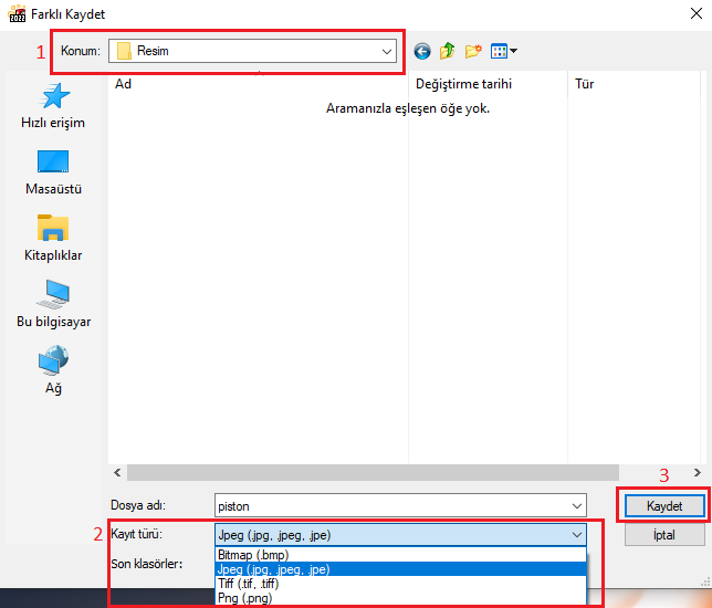 Açılan pencereden dosyanın nereye kaydedileceğini ve formatını seçtikten sonra “Kaydet” seçeneğine tıklayalım.