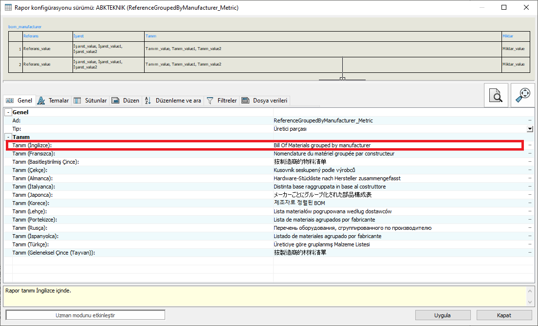 Başlangıçta Belge Ağacı’nda Malzeme Listesi’ni açtığınızda, eski sürümleri göreceksiniz. Düzenlenen tablonun görünmesi için Malzeme Listesi’ne sağ tıklayın ve Rapor Teknik Resimleri Güncelle’yi seçin.