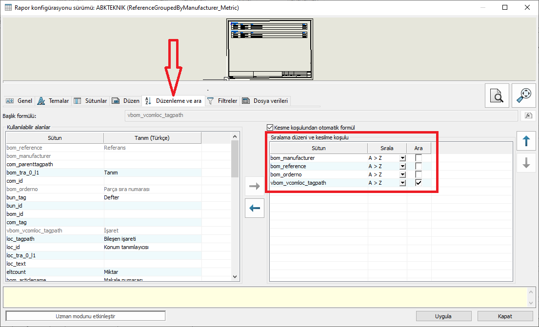 Düzenleme ve Ara sekmesi gitmek istediğimiz yerdir. Burada Malzeme Listenizi nasıl gruplandırmak istediğinize karar verebilirsiniz. Varsayılan olarak, BOM üreticisi en üstte yer alır. Sıralamayı yeniden düzenleyin ve Lokasyonumuzu yukarıya taşıyın.