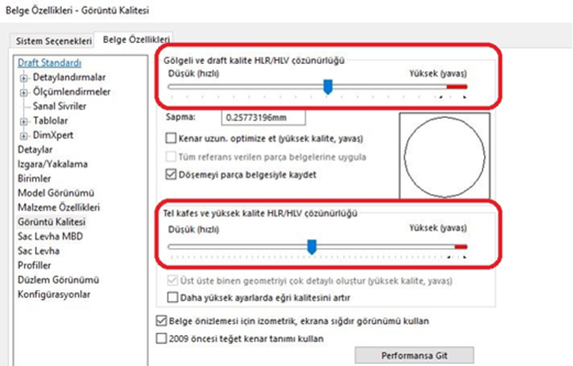 Solidworks seçenekleri içerisinden belge özelliklerini açıyoruz. Ardından sol tarafta açılan pencereden görüntü kalitesini seçiyoruz. Buradan “Gölgeli ve draft kalite HLR/HLV çözünürlüğü” seçeneğini kırmızı çizgini başlangıç noktasına kadar arttırıyoruz. “Tel kafes ve yüksek kalite HLR/HLV çözünürlüğü” içinde aynı işlemi tekrarlıyoruz.