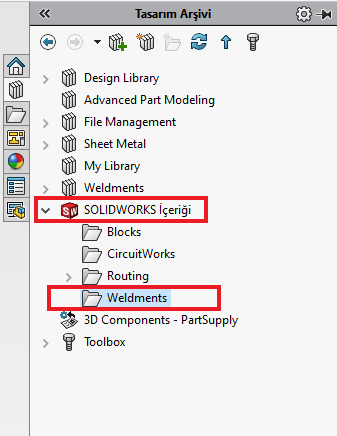 Tasarım Arşivi’nde SOLIDWORKS İçeriği’nin altındaki Weldments doyasını seçelim.