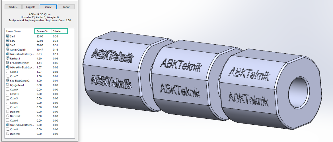 Performans Değerlendirme aracını kullanarak her bir unsuru yeniden oluşturmanın zaman olarak süresini görebiliriz. Tüm parça için yeniden oluşturma süresi 1,50 saniye olarak görülmektedir. Bu durum parça-montaj boyutu ve bilgisayar özelliklerine göre değişkenlik gösterebilir. Sar komutu ile oluşturulan parçaların en yüksek süreye sahip olması beklediğimiz bir durumdu. Ayrım Çizgisi komutu da Sar-Çiz komutundan daha iyi bir performans göstermiştir. Verimliliği aşağıdaki resimde detaylı bir şekilde inceleyerek değerlendirebilirsiniz.