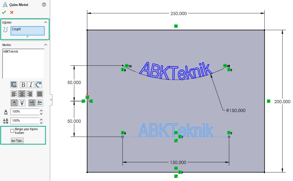 Oluşturulan metni Çizim Metni sekmesinde Eğriler bölümüne çizgi, yay, daire, spline veya kenar seçimi yaparak konumlandırabiliriz. Konumu daha detaylı yönlendirmek adına bu eğrileri farklı şekillerde oluşturabiliriz.