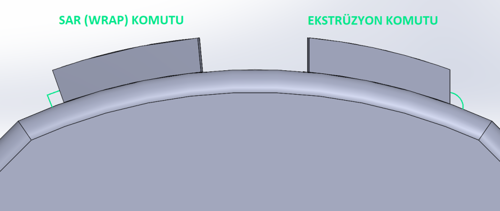 SOLIDWORKS Metin oluşturma için Ekstrüzyon ile Katı Oluşturma (Extruded Boss), Ekstrüzyon ile Kes (Extruded Cut), Ayrım Çizgisi (Split Line) ve üç farklı Sar (Wrap) komutunu ele alacağız. Bu araçları kullanarak parça üzerinde yazıya yükseklik verebilir, yazının parça içine doğru girintili olmasını sağlayabilir veya parça yüzeyini bölerek aynı yüzey üzerinde farklı bölge oluşturabiliriz. Bu komutların tamamını düz ve eğimli yüzeylerde kullanabilmek mümkündür.