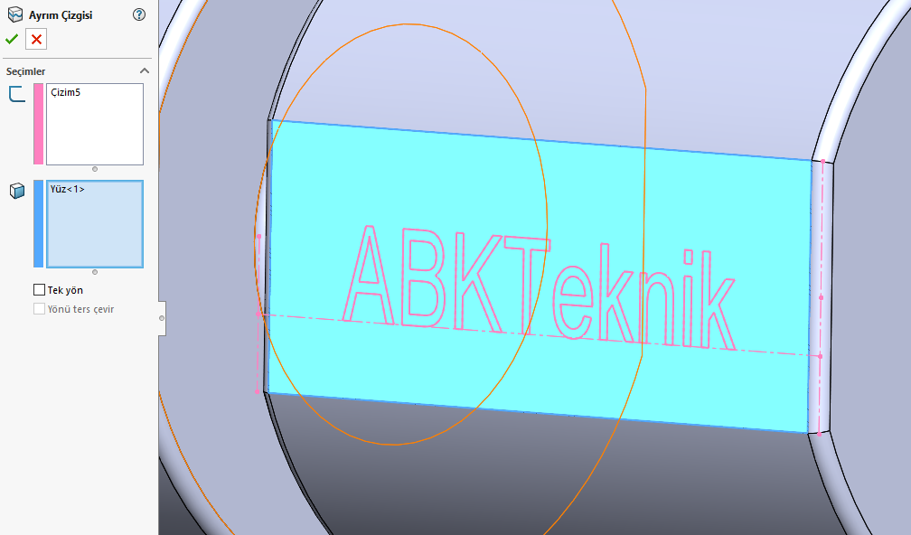 Ayrım çizgisi aracı yüzeyi birden çok yüzeye üç farklı metot ile bölmektedir: Silüet (Silhouette), Yansıtma (Projection) ve Kesişme (Intersection). Yansıtma seçeneği metinlerin parça yüzeylerine modellenmesinde kullanışlı bir seçenek olarak karşımıza çıkmaktadır. Eğimli ve düz yüzeylere, istediğimiz yazıyı yansıtmamızı sağlamaktadır.