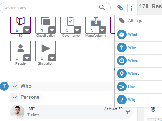 3DEXPERIENCE yöntemi modern, tarayıcı benzeri bir his verir ve en iyi sonuçları geniş bir arama terimiyle başlatıp ardından buradan filtreler. 3DEXPERIENCE, filtrelemek için 6W etiketlerini kullanır. 6 W; Who(Kim), What(Ne), When(Ne zaman), Where(Nerede), Why(Neden) ve hoW(Nasıl) dır. Birkaç tıklama içinde, arama sonuçlarınızı yönetilebilir, bir sayıya çekebilir ve çalışmaya başlayabilirsiniz. Kullanıcılar, dosyalarını bulmanın yolunu öğrenmekten daha kolay bir yol olarak 6W etiketlerini kullanabilirler