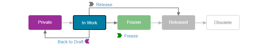 Başlangıçta, 3DEXPERIENCE Platformu basit bir onay süreci gibi görünse de durum gerçekte böyle değildir. Kullanıma hazır varsayılan belgenin yaşam döngüsü beş aşamadan oluştuğu doğru olsa da (yukarıya bakın), bunu durum geçişleri olarak bilinen rotalarla destekleyebiliriz.