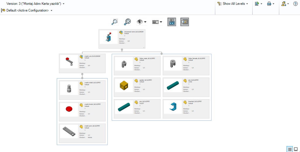 SOLIDWORKS PDM ve 3DEXPERIENCE CLOUD PDM, yukarı ve aşağı yöndeki CAD referanslarını takip eder. Bir belgeyi sorgulamak üst montajını veya alt montajını bulmak hızlı bir işlemdir. Her iki sistem de tüm referans seviyelerini bulabilir; diğer bir deyişle, en üst seviyedeki bir montajdan başlayabilir ve referansları bir alt montajdaki en küçük parçaya kadar inebilirsiniz (ya da tam tersi şeklinde).