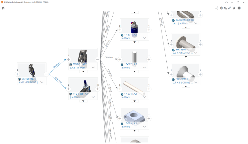 3DEXPERIENCE, bir montaj veya parça seçildiğinde, parçaların ve malzemelerin bir ağacını gösterir. Bu, bir malzeme listesiyle aynı bilgileri içerir, ancak daha farklı bir şekilde gösterilir.