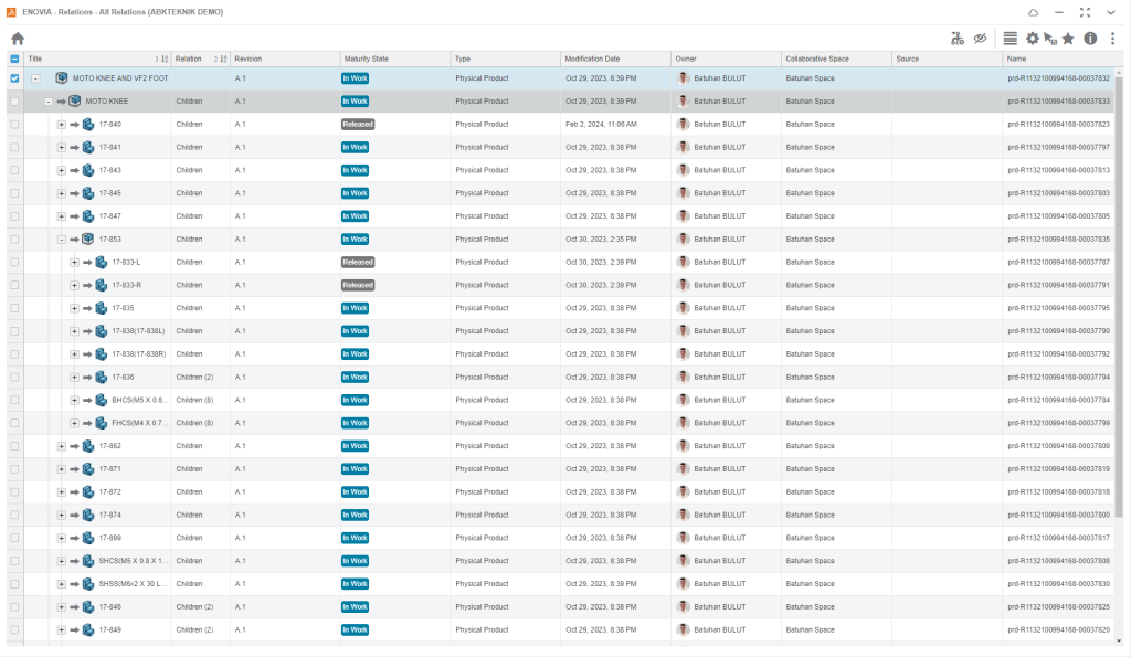 SOLIDWORKS PDM ve 3DEXPERIENCE CLOUD PDM, dosyalara ilişkin tüm materyal listelerini izler. Malzeme listeleri, bir montajın bileşenlerinin ve her bir bileşenin ayrıntılarının tam bir listesidir.