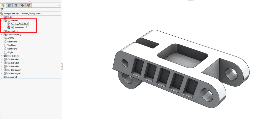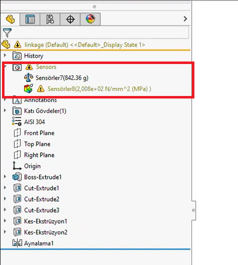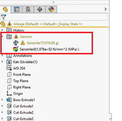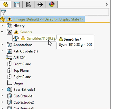 SOLIDWORKS içerisinde sensörler ile bunun gibi birçok çalışma gerçekleştirerek tasarımlarınızı limitler içinde tutabilirsiniz.