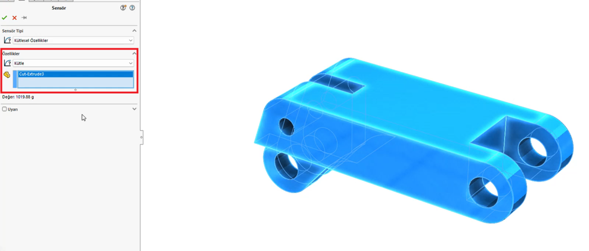 Açılan bölümde kütlesel özellik olarak parçanın kütlesi için bir kriterimizin olduğunu sensör olarak oluşturalım. Şu an parçamız 1000 gram üzerinde gözüküyor. Kırmızı ile işaretlediğimiz bölümde parçanın seçimini yapıyoruz.