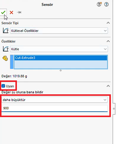 Tasarımımızın kütle veya hacim değerlerine göre bir tanımlama yapabiliriz. Yani belirli bir değerin altında veya üstünde tasarım oluşturduğumuzda sensörün uyarı vermesini sağlayabiliriz.