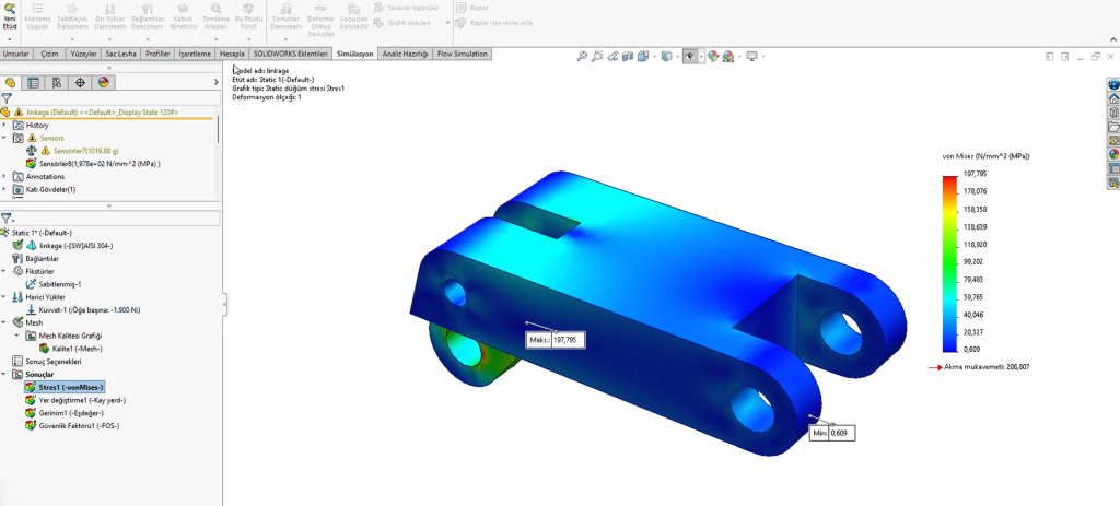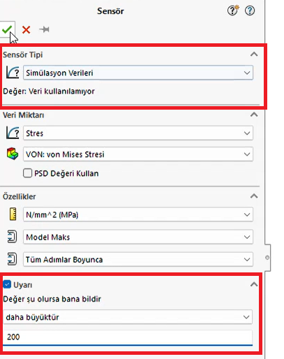 Şimdi parçanın mukavemeti için bir sensör oluşturuyorum. Sensöre sağ tıklayıp yeni bir simülasyon sensörü ekliyorum. Burada parça üzerinde maksimum gerilme değerinin 200 MPa üzerinde olduğunda uyarı vermesini istiyorum.