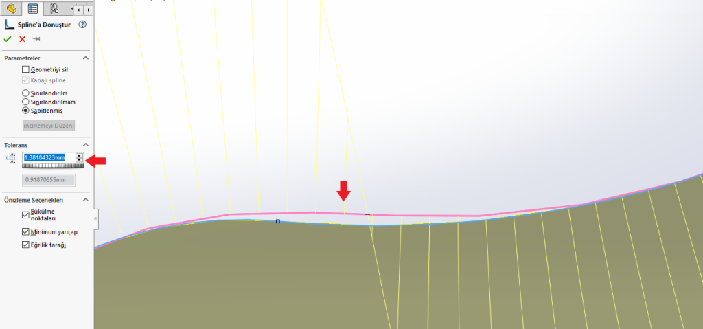Spline’a Oturt komutundayken, birleştirilmek istediğiniz çizgileri tek tek ya da bir çizgiye sağ tıklayıp “Zinciri Seç” ile seçebilirsiniz. Çizim geometrisi seçildiğinde ön izleme gözükür ve daha sonra Tolerans ayarlayabiliriz. Toleransı arttırdığımız ölçüde sert kenarın düzleştiğini görürüz.