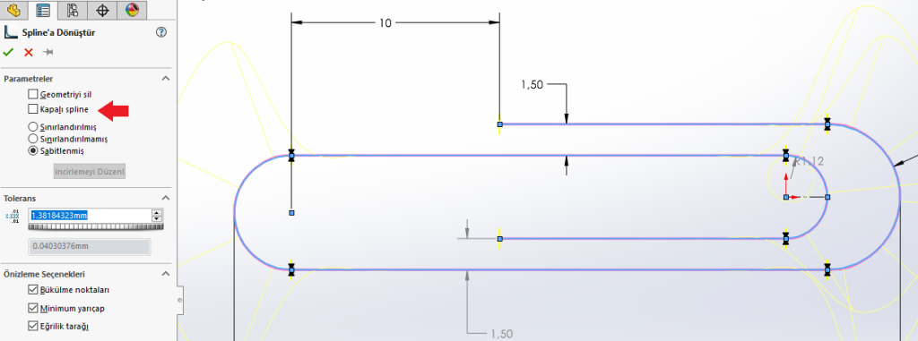 SOLIDWORKS Spline Oturt Komutu ile Teğet Kenarları Yok Etme