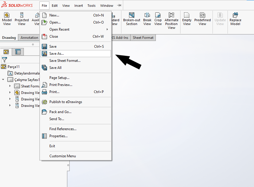 Gerekli ayarlamaları Teknik Resim sayfamızda yaptıktan sonra ise “Dosyayı Farklı Kaydet” seçiyoruz.
