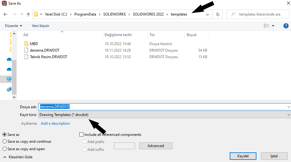 Farklı Kaydet kısmını geçtikten sonra ise kayıt lokasyonun seçmemiz gereken yer SOLIDWORKS templates klasörü ve Kayıt türü ise (*.drwdot) kısmıdır.
