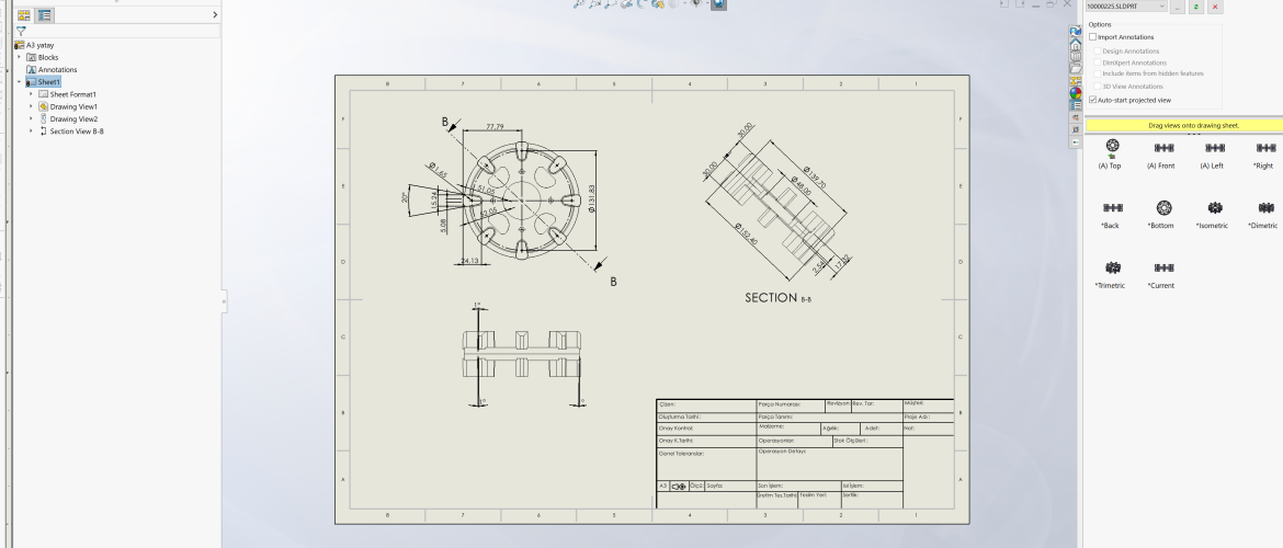 Parçamızın seçiminden sonrasında, ise istediğimiz yönde olan kesit resimlerini teknik resim sayfamıza bırakıyoruz ölçülendirme kısmında ise “çizim” sekmesine tıklayıp ve ardından akıllı ölçülendirme ile parçanın ölçülendirmesine yapmış oluyoruz.