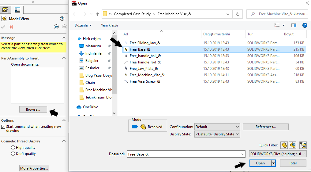 Oluşturulan parçanın seçimi ile alakalı model görünümü sekmesinden alt kısımda bulunan “Eklenecek Parça/Montaj” gözat kısmından seçili olan parçayı teknik resimin üzerine sürükleyerek bırakıyoruz.