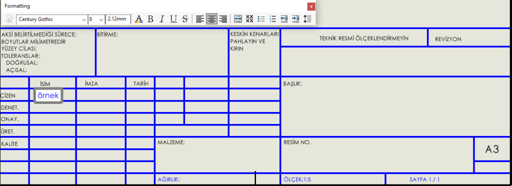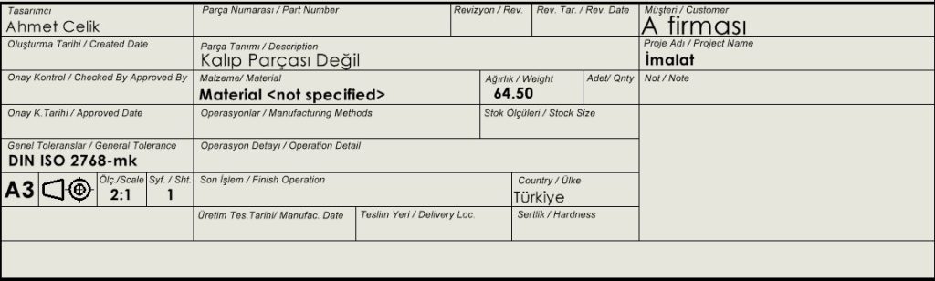 Teknik Resimde özel özelliklerde tanımladığımız değerler antetimize geçmiş olacaktır aşağıda bulunan resimlerde görüldüğü gibi